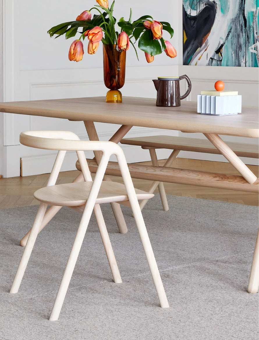 Halikko Bar Stool was designed 2016 by the Finnish brand Made by Choice. Sleek and comfy furniture with a simple structure and obscurely quirky characteristics. Based on a structure in solid oak, Halikko draws a natural continuation of the exploratory work by Choice on straight-forward structures, and expressive graphic surface treatments.